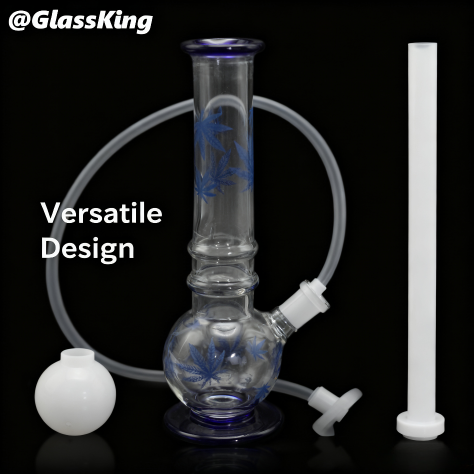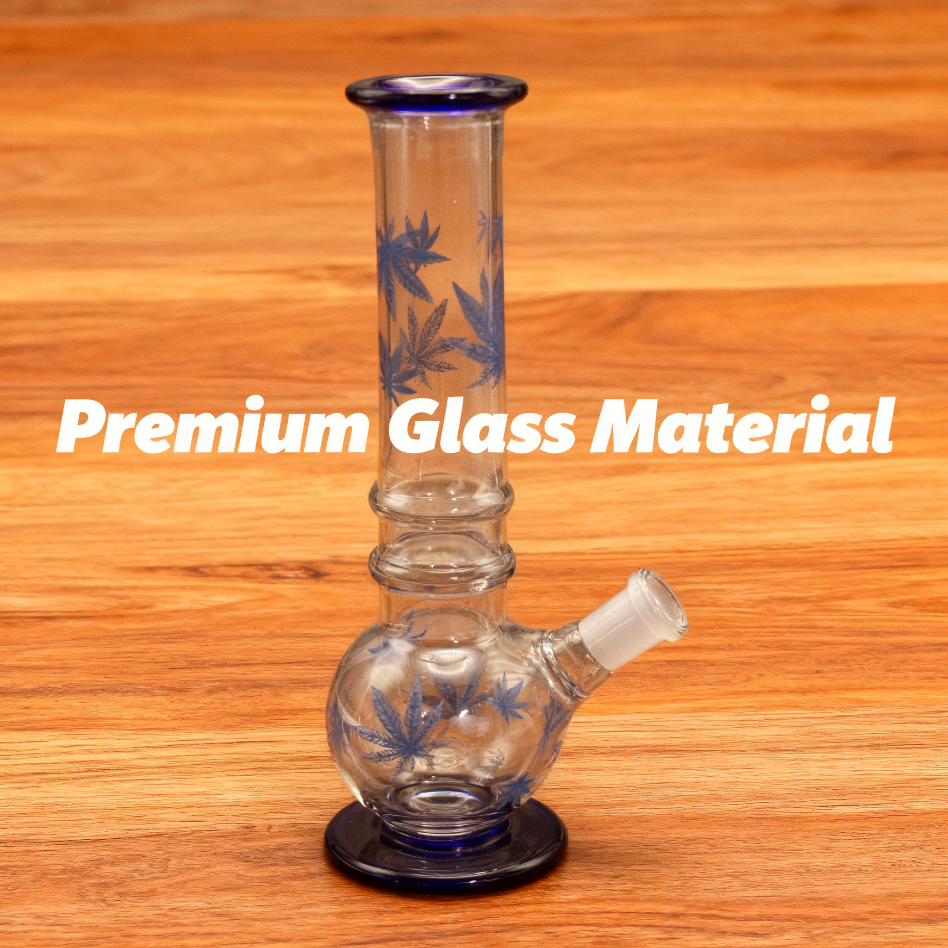 • Name: Blue Leaf Pattern Glass Bong Features: Crafted from transparent glass with blue hemp leaf patterns. Blue accents adorn the top and bottom edges. Features a spherical base and vertical stem, complete with a white mouthpiece. Purpose: Used for hookah smoking, filtering smoke through water to enhance the smoking experience.